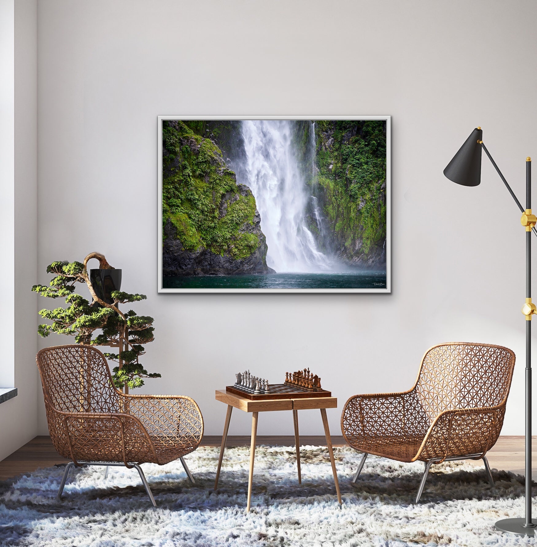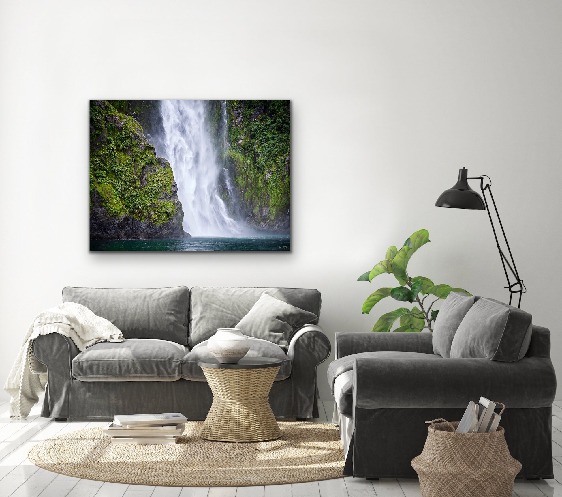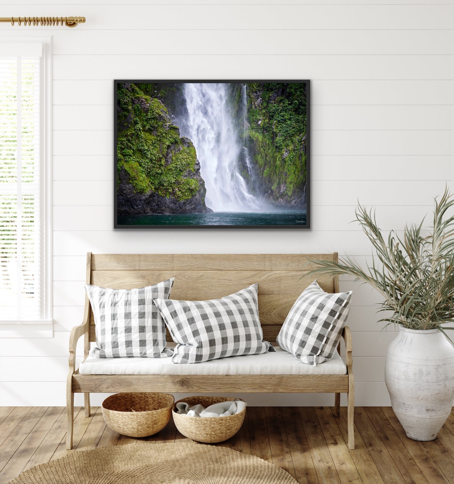 "Milford Sound, New Zealand, is known for its towering Mitre Peak, it's rainforests, waterfalls, and breathtaking beauty. Home to penguins, dolphins, and seals, Milford is a bustling tourist attraction. Take a trip daily with this image on your wall. This waterfall will take your breath away."