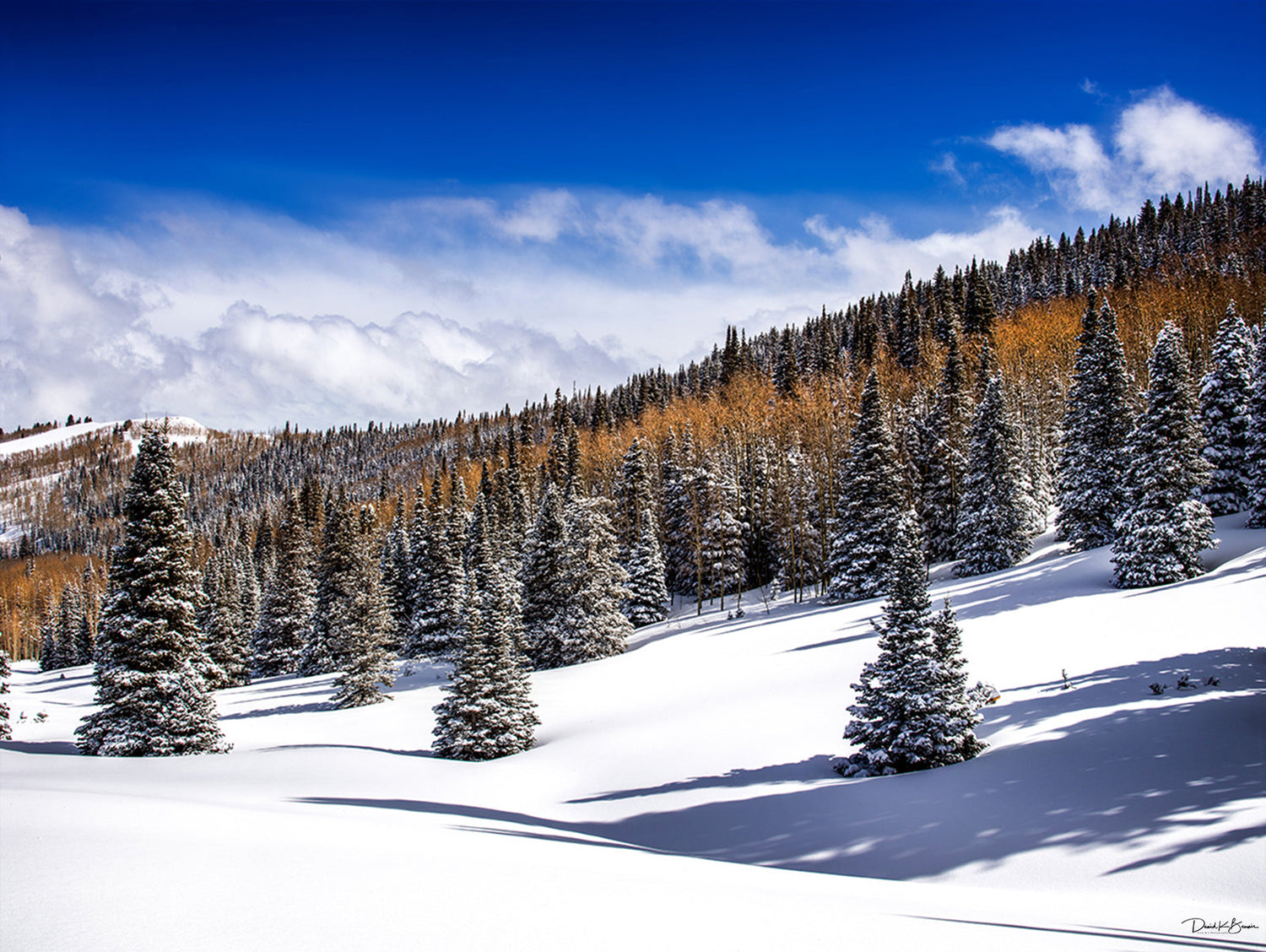"This is one of my favorite images I have taken in Park City. Taken after an overnight snowfall, I captured this image around mid-morning as the shadows danced upon the snow. With the beautiful colors of green, gold, and blue adding to this magical still morning."
